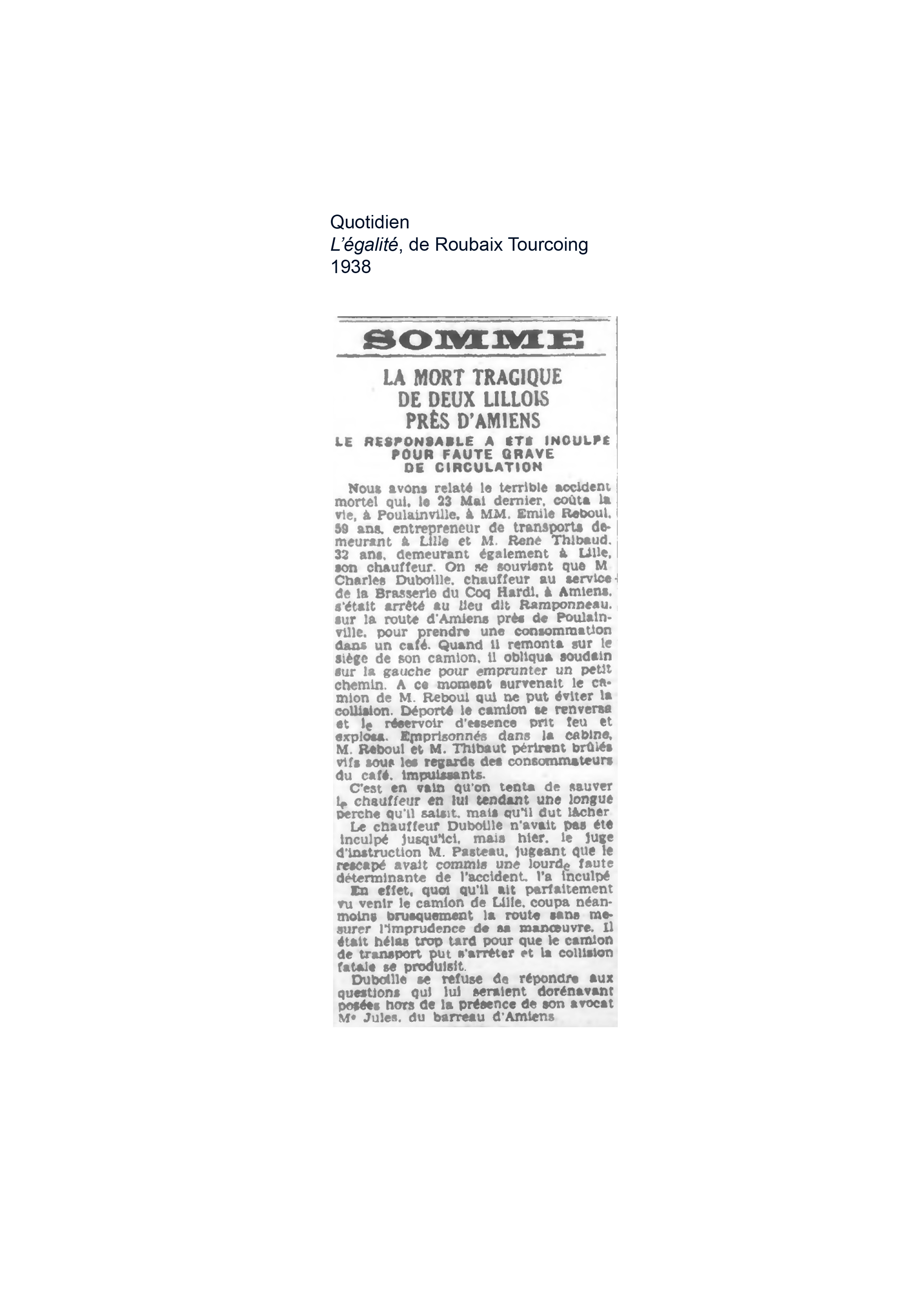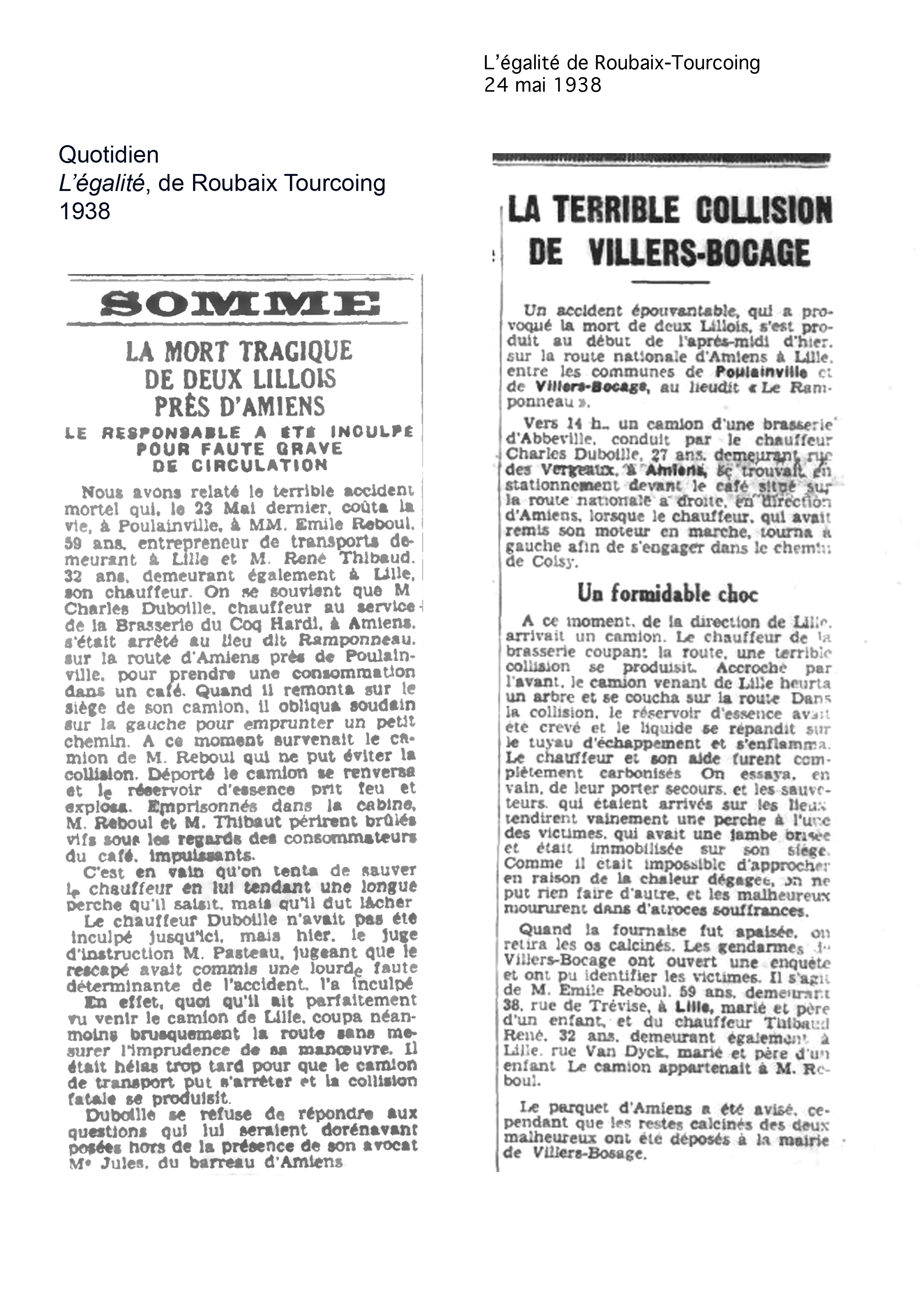 Un accident de circulation à Poulainville : la collision de deux camions qui provoqua la mort de deux Lillois le 23 mai 1938.